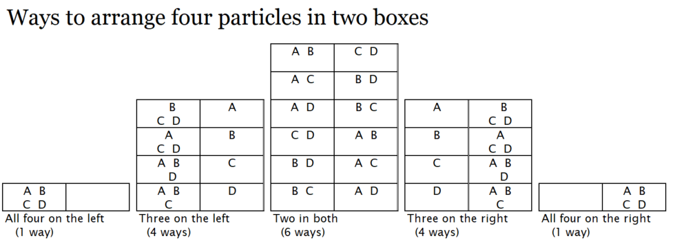 It is 1/16 for each four-in-one, 1/4 for each three-in-one, and 3/8 for the two-in-each. There are six ways to have two on each side so this is the most common arrangement. In the terminology used in this area of study, this is described by saying that there are six microstates in which there are two particles in each box. The two particles on each side arrangement is called a macrostate. Although we labeled the particles they would in reality be indistinguishable. So all six of these states are actually all exactly the same. When there are mutliple ways to arrange the same situation, or macrostate, those ways are called microstates. Systems naturally arrange themselves in a macrostate which has the maximum number of microstates, not because there is something forcing them to do so but simply because those macrostates are the most probable.